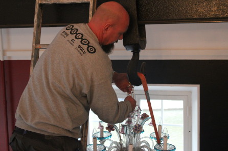 Nina och jag stod på entresolet med andan i halsen och tittade på medan killarna skulle hänga lampan på kroken…